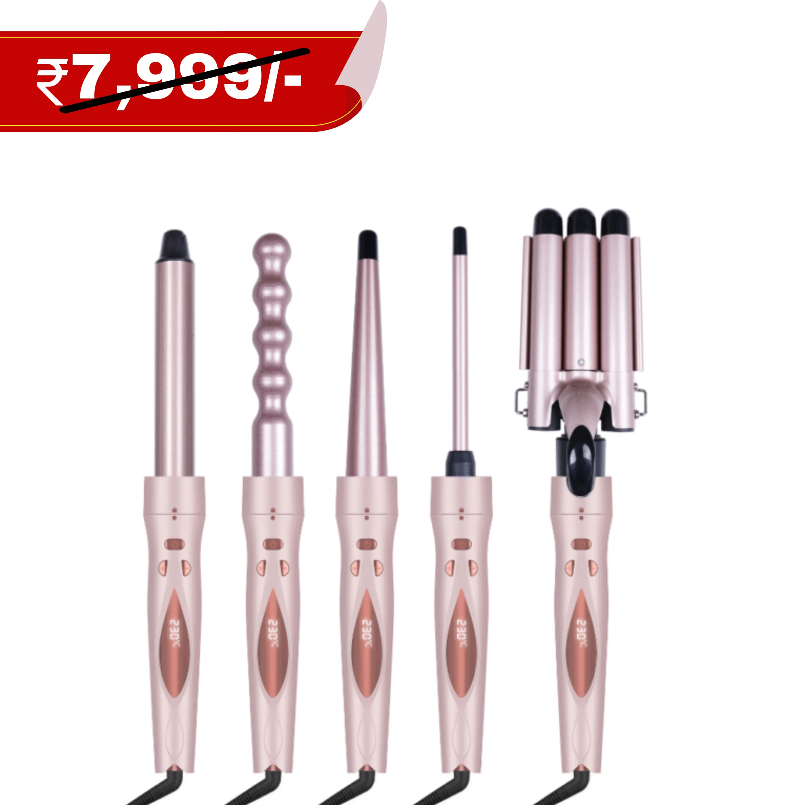 Change your everyday look with this 5-in-1 interchangeable hair curling set. Designed with premium ceramic-coated barrels and fast PTC heating technology, this multi-styler delivers smooth, shiny, long-lasting curls without damaging your hair. Whether you want tight curls, beachy waves, soft, loose curls, or glamorous Hollywood waves, it styles every hair type effortlessly.