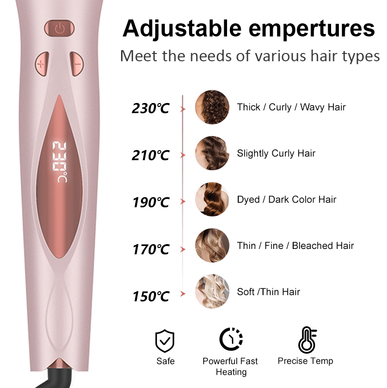 The adjustable temperature (140°C – 230°C) and clear LCD allow precise heat control, making it suitable for all hair textures — from fine and silky to thick and coarse. The quick-lock barrel system lets you switch attachments in seconds, while the 360° swivel cord ensures comfortable styling without tangling.